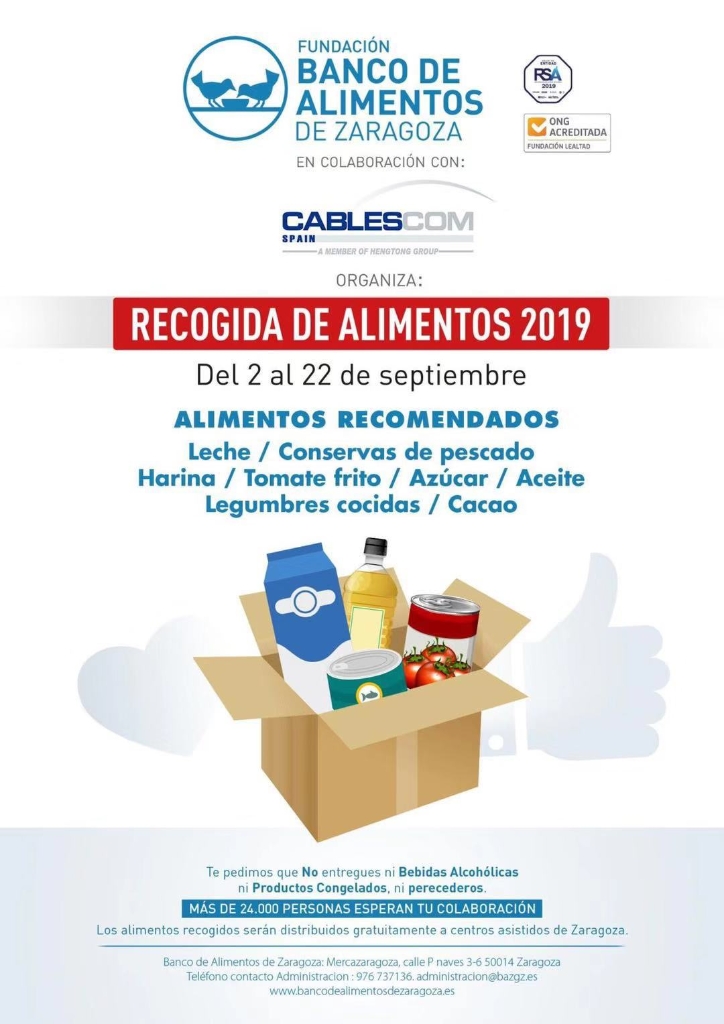 From September 2 to 22, HENGTONG CABLESCOM had a food collection activity in collaboration with the Zaragoza Food Bank, The Cablescom employees have the the opportunity to collaborate. The collected food will be distributed freely among some Care Homes in Zaragoza.