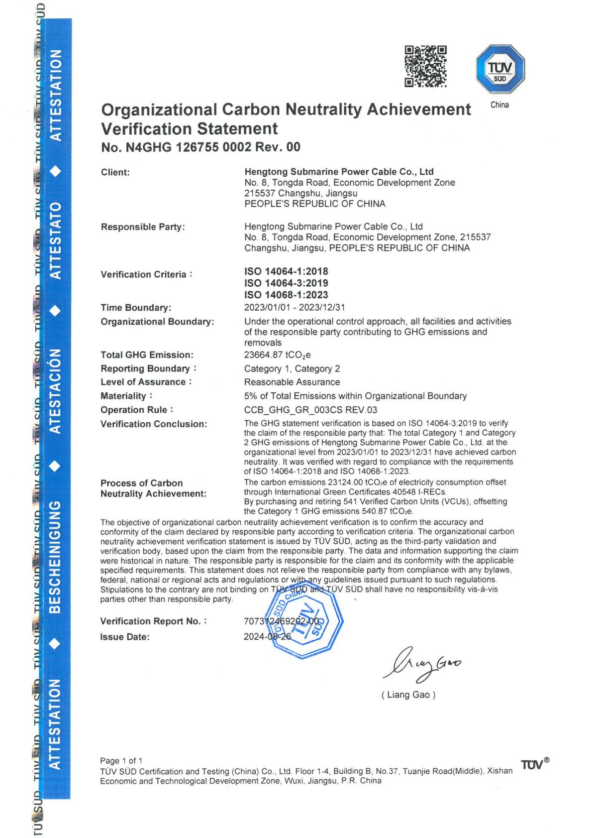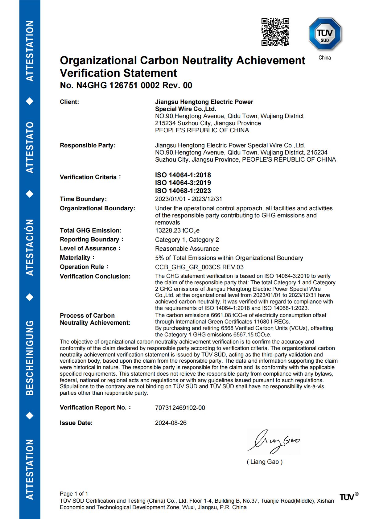 Four companies under the Hengtong Group have achieved the Organizational Carbon Neutrality Verification Statement in accordance with ISO 14068 standards.